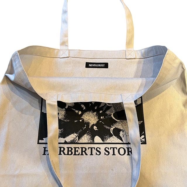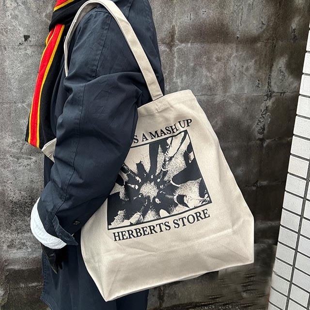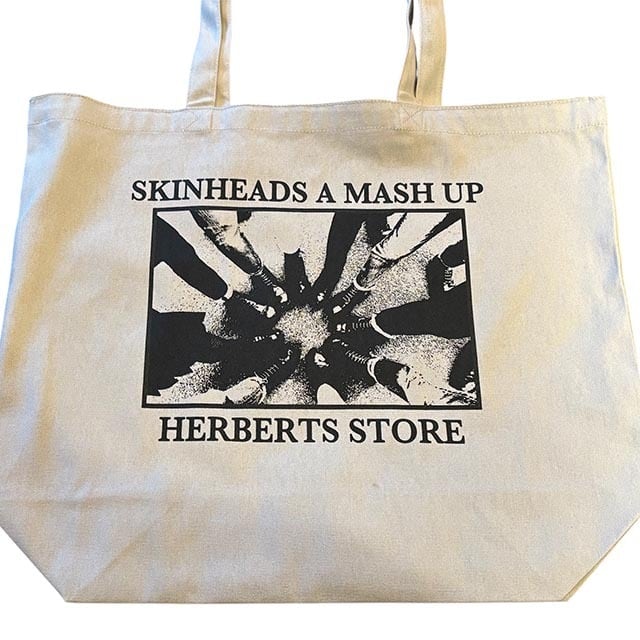 スキンズがたむろするハーバーツストアをイメージするフォトプリントのトートバッグ。