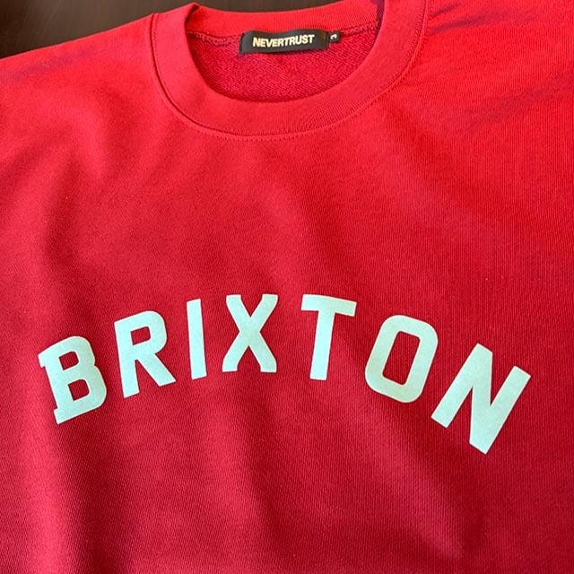 今夏Tシャツが大好評だった、THE CLASH ポール・シムノンやドン・レッツ、デヴィッド・ボウイなどの有名なミュージシャンが育ったロンドン南部に位置するエネルギッシュな街「BRIXTON」のロゴがフロッキーでプリントされたスウェットです。