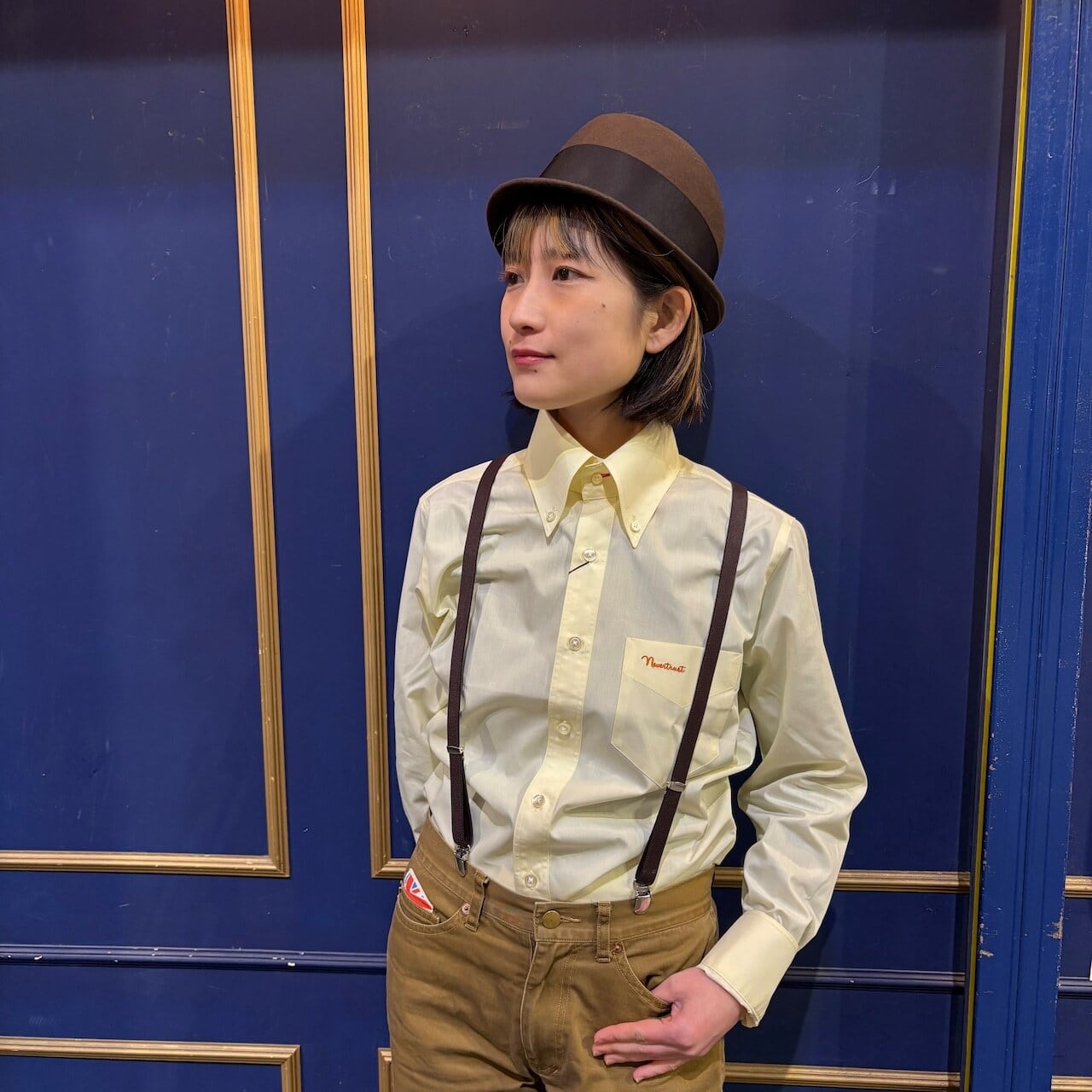 第一ボタンホールはレッドの配色のアクセント。胸ポケットのワンポイント刺繍入り。