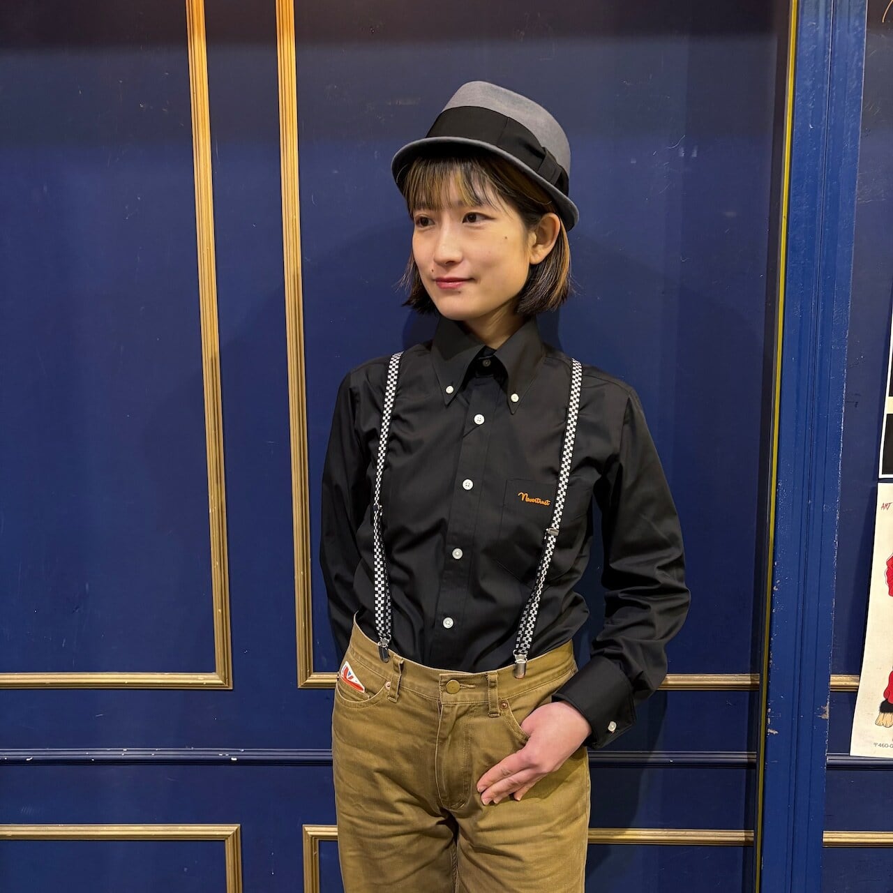 裾脇補強ピース、背ハンガーループ、菱形ネーム台付き。