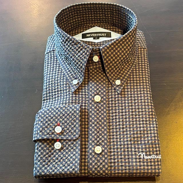 第一ボタンホールはレッドの配色のアクセント。胸ポケットにNevertrust筆記体の刺繍入り。裾脇補強ピース、背ハンガーループ、菱形ネーム台付き。背中はポックスプリーツ仕様。裾の下前にサプ・ネーム付き。
