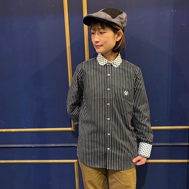 襟はショートラウンドカラーの隠しボタンダウンです。身体に沿ったスリムフィットの美シルエット。菱形ネーム台はサックスダンガリーの配色。衿と袖の第一ボタンホール、カフスボタンホールはレッドの配色のデザイン。