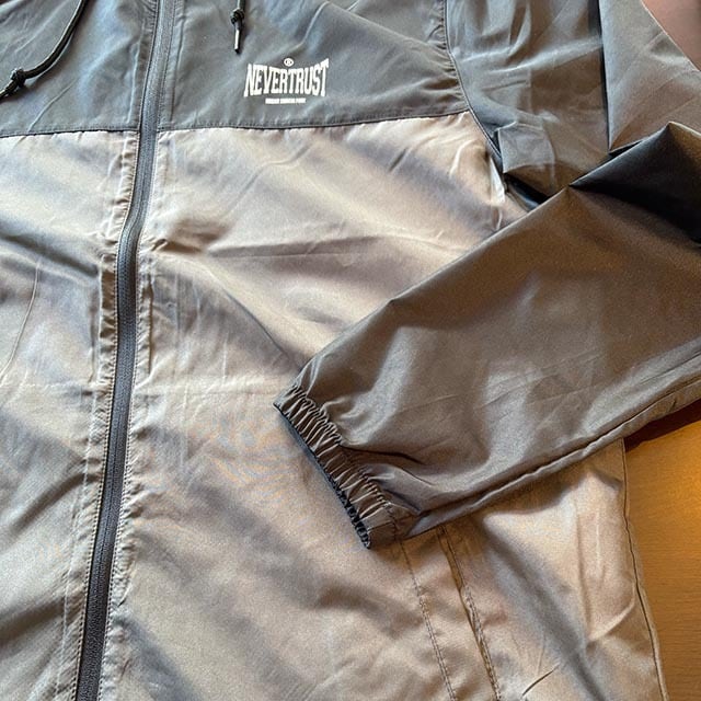 フロントは上下でバイカラーに切り替えたデザイン。雨や風の侵入を防ぐ止水ジッパーを採用しています。