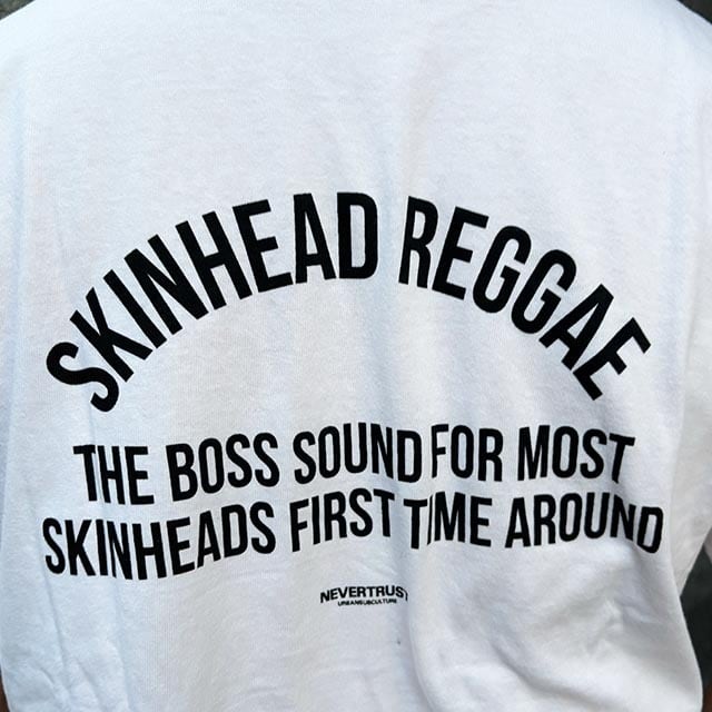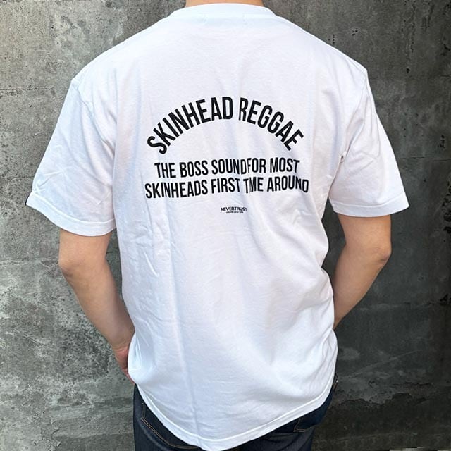 バックには"THE BOSS SOUND FOR MOST. SKINHEAD FIRST TIME AROUND"のフレーズをプリント。これはスキンヘッドカルチャーの歴史の記した名著「Spirit of '69 : A Skinhead Bible」(ジョージ・マーシャル著)の中で、当時のレゲエ / ボスサウンドを象徴する言葉として使われた印象的なフレーズです。袖にピスネーム付き。