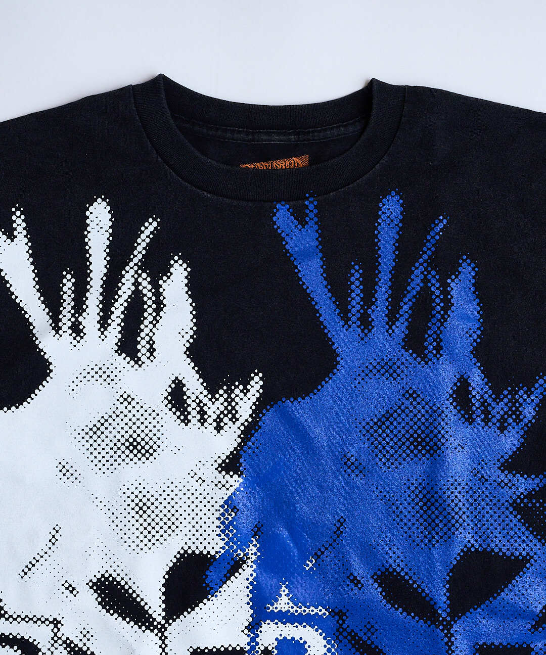 左右で異なるプリントカラーを採用し、視覚的なズレや違和感が立体的な印象を生み出すTシャツに。