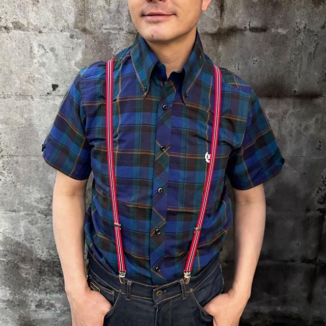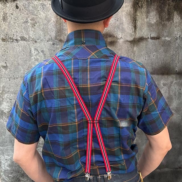 トラディショナルなストライプ×H型バックルのナロー(細幅)のサスペンダーです。
