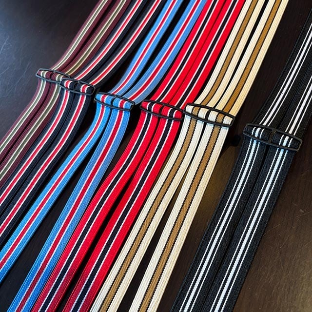 トラディショナルなストライプ×H型バックルのナロー(細幅)のサスペンダーです。