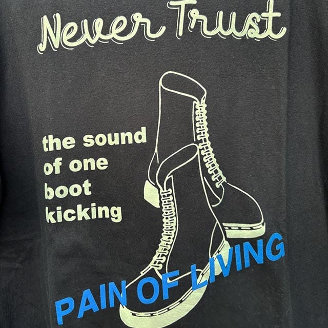 PAIN OF LIVINGは「生きる痛み」。生きることに伴う苦悩や葛藤を孕んだ、スキンヘッドらしいメッセージ、印象的なフレーズです。袖にピスネーム付き。
