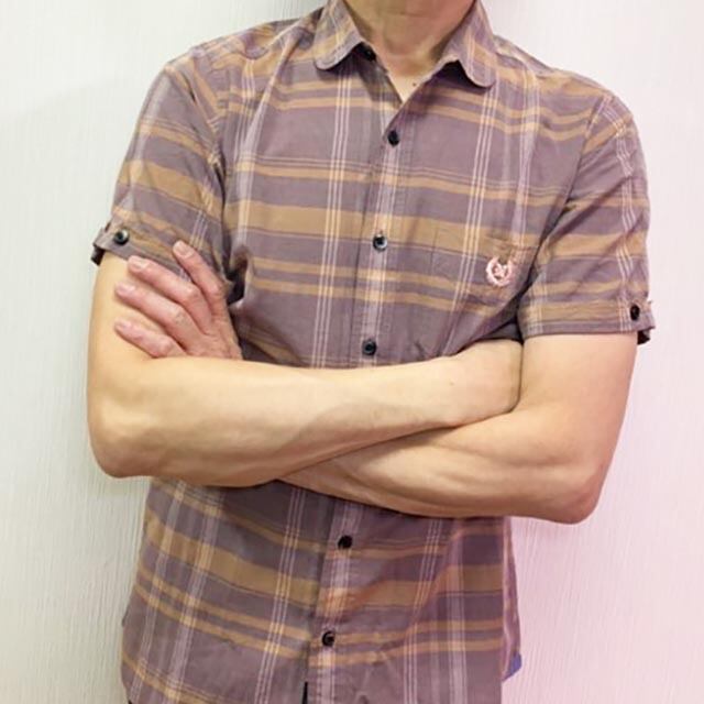 軽快な印象のアースカラーチェックのショートラウンドカラーの半袖シャツ。