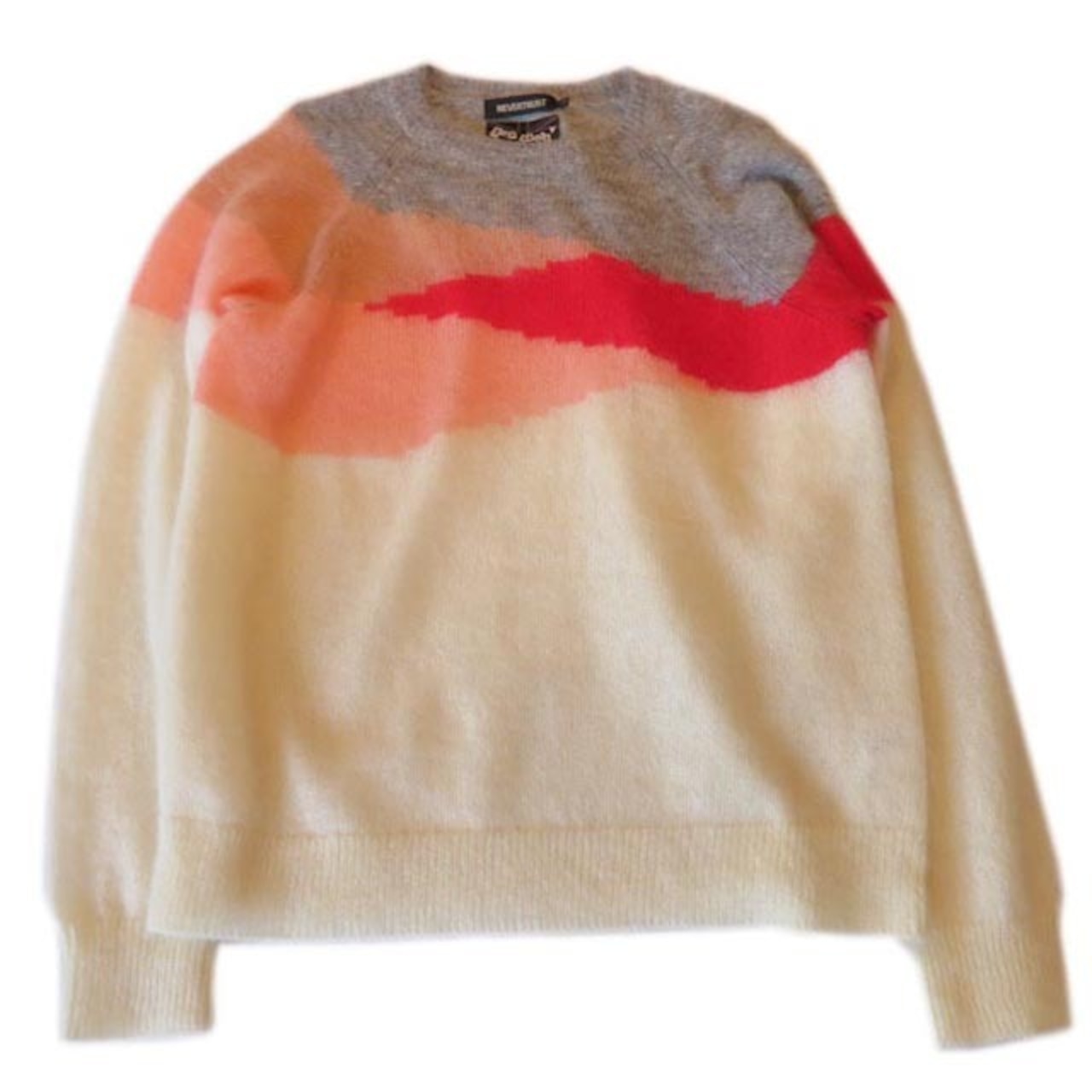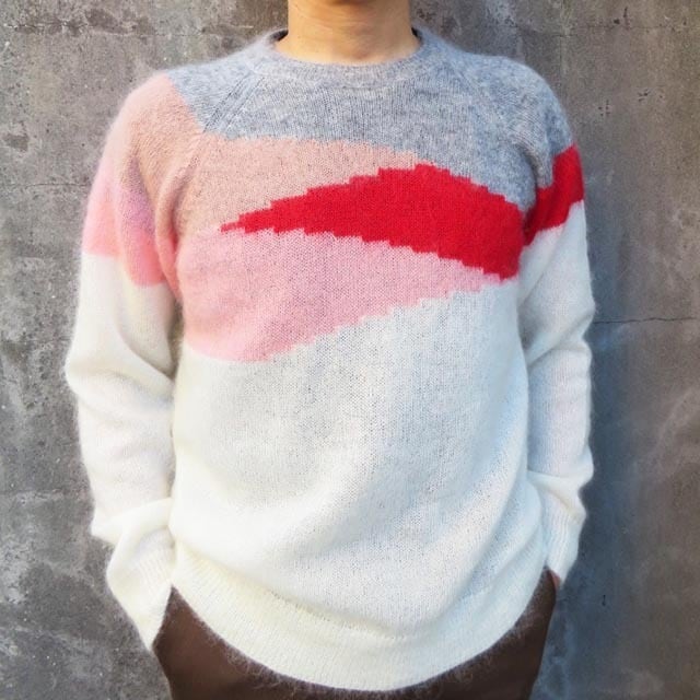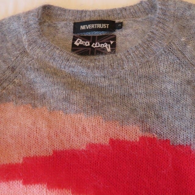 名古屋の老舗パンクショップ「BLACK MARKET」がNEVERTRUSTに別注した、パンキッシュな幾何学模様を全面に打ち出したモヘア・ニット・セーター。
