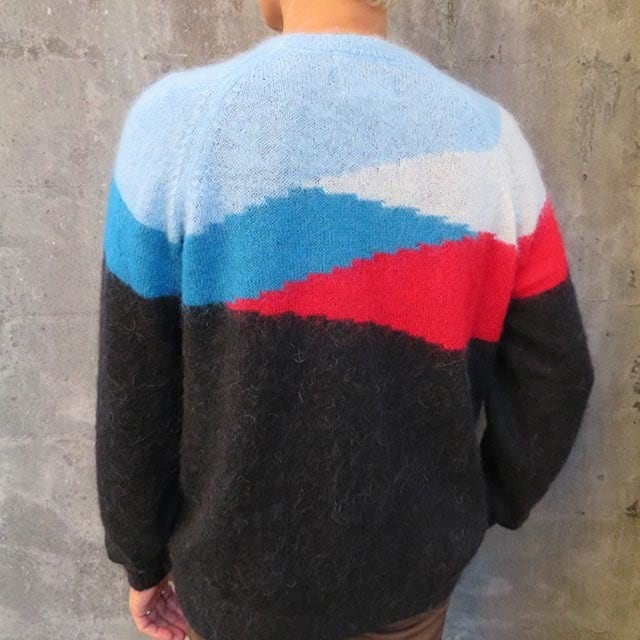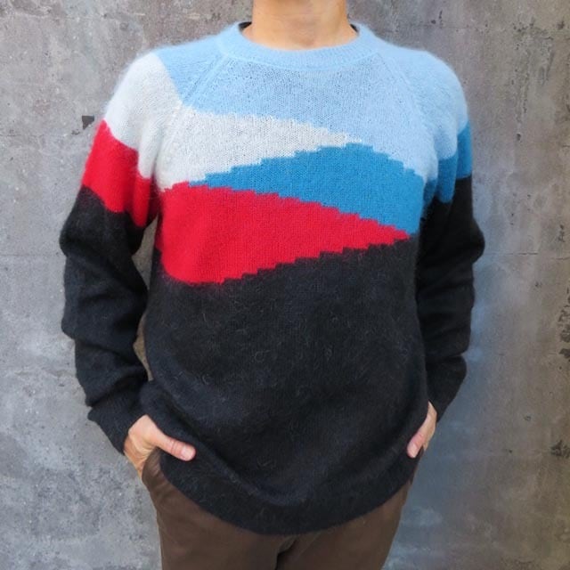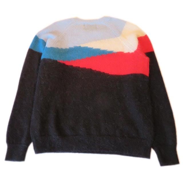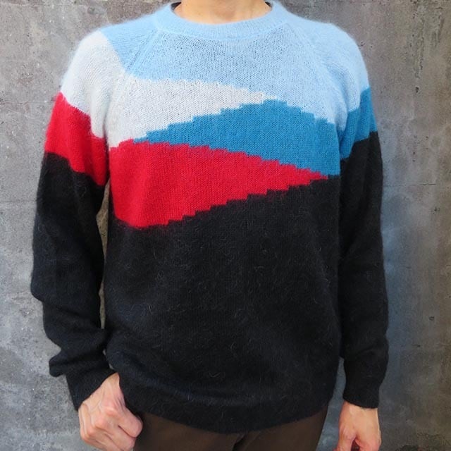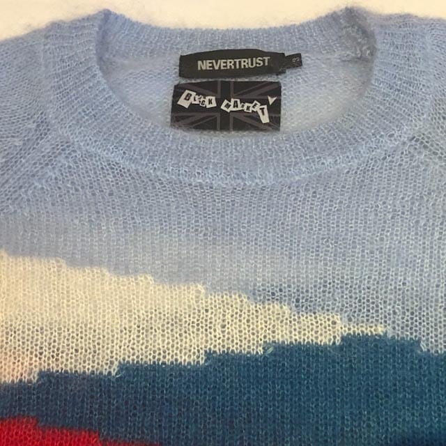 名古屋の老舗パンクショップ「BLACK MARKET」がNEVERTRUSTに別注した、パンキッシュな幾何学模様を全面に打ち出したモヘア・ニット・セーター。