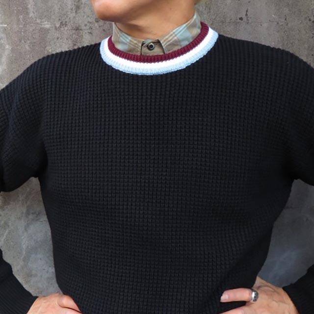 ワッフル・ライン入りクルーネック・セーター BLACK