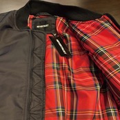 表地は摩擦や雨風に強いタフなヘヴィーナイロンを使用し、裏地はスベリの良いロイヤルスチュアート・タータンチェック。ファスナー付き内ポケットあり。