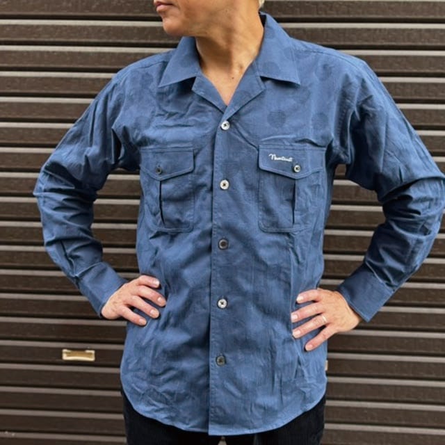 淡いブルーのドット柄のジャガード(織)素がの目を引くカバーオールシャツ。